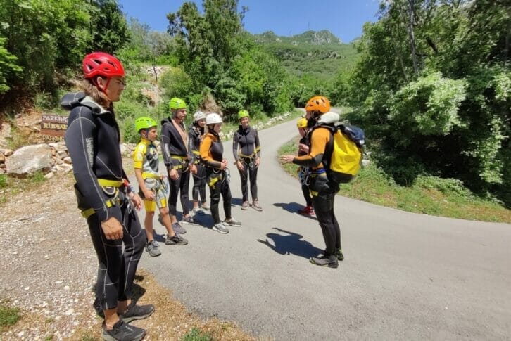 Arriving in front of the canyon, the starting point for canyoning Drenovštica. Equipping participants with canyoning sneakers, canyoning belts, helmets, neoprene suits, and neoprene socks. Your adventure begins with a short introduction and safety procedures led by your guide/skipper.