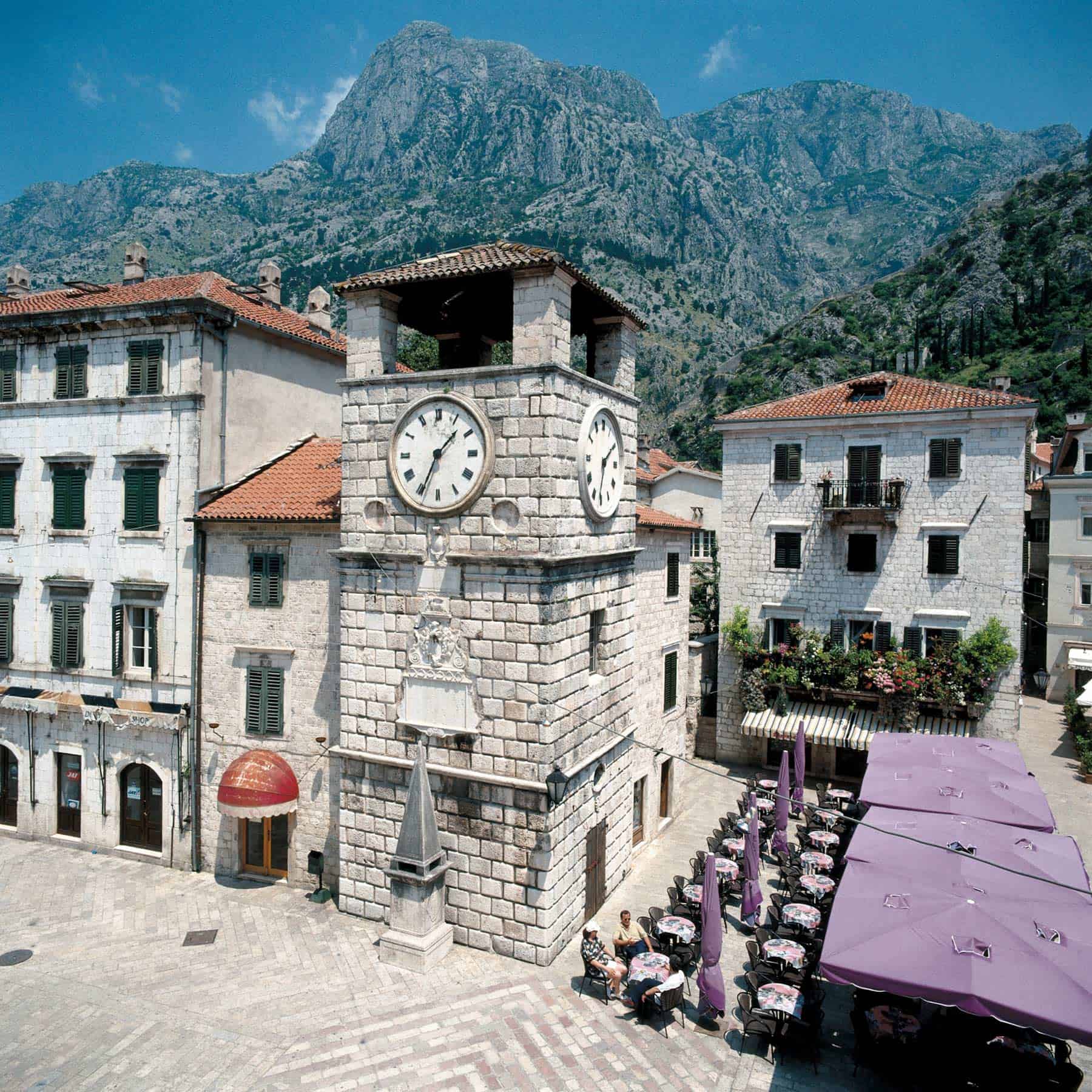 Clock tower in Kotor’s old town in Montenegro